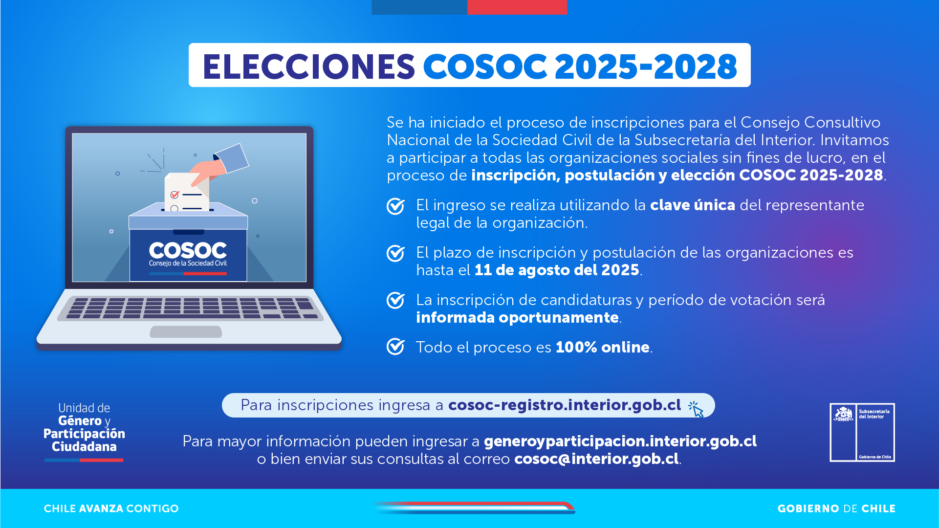 La Comisión Electoral del Consejo Consultivo Nacional de la Sociedad Civil (COSOC) de la Subsecretaría del Interior, convoca a las organizaciones y asociaciones sin fines de lucro a inscribirse para participar en el proceso de elecciones del COSOC 2025-2028.