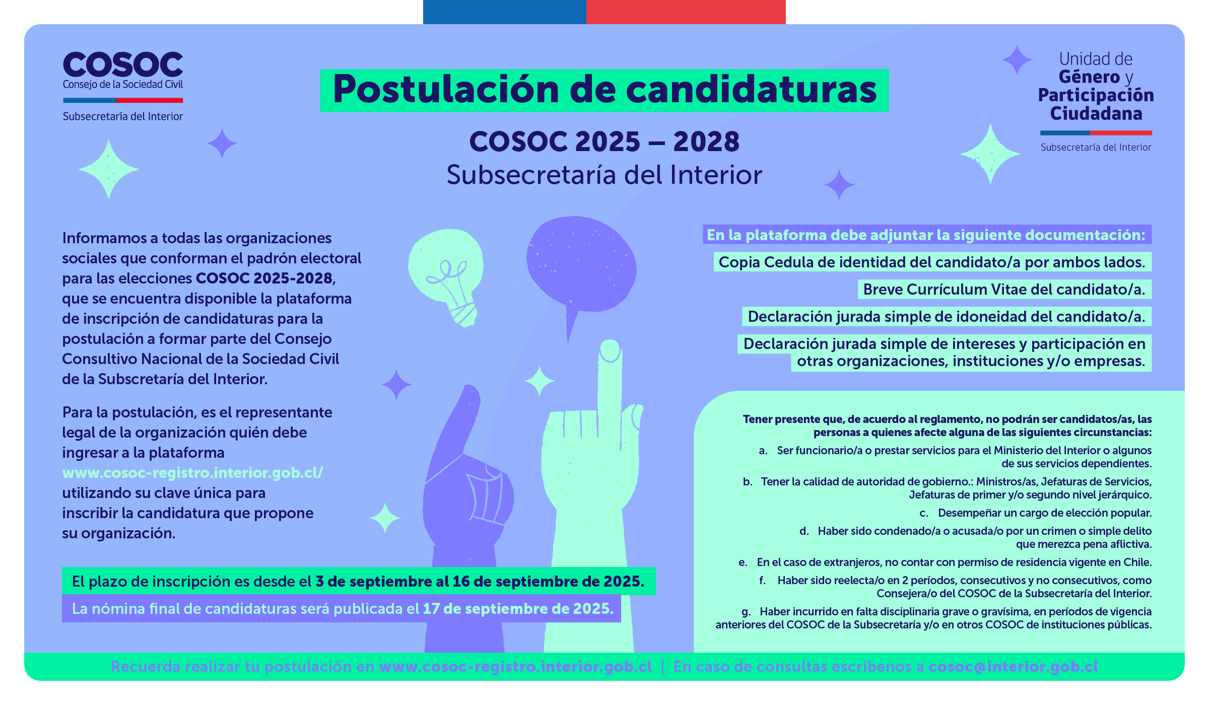 Estimados/as representantes de organizaciones sociales que conforman el padrón electoral para el proceso de elecciones de Consejo Consultivo Nacional de la Subsecretaría del Interior 2025-2028, les informamos que se ha iniciado la segunda etapa de este proceso, en la cual las organizaciones del padrón tienen la opción de inscribir una candidatura para formar parte del Consejo Consultivo.