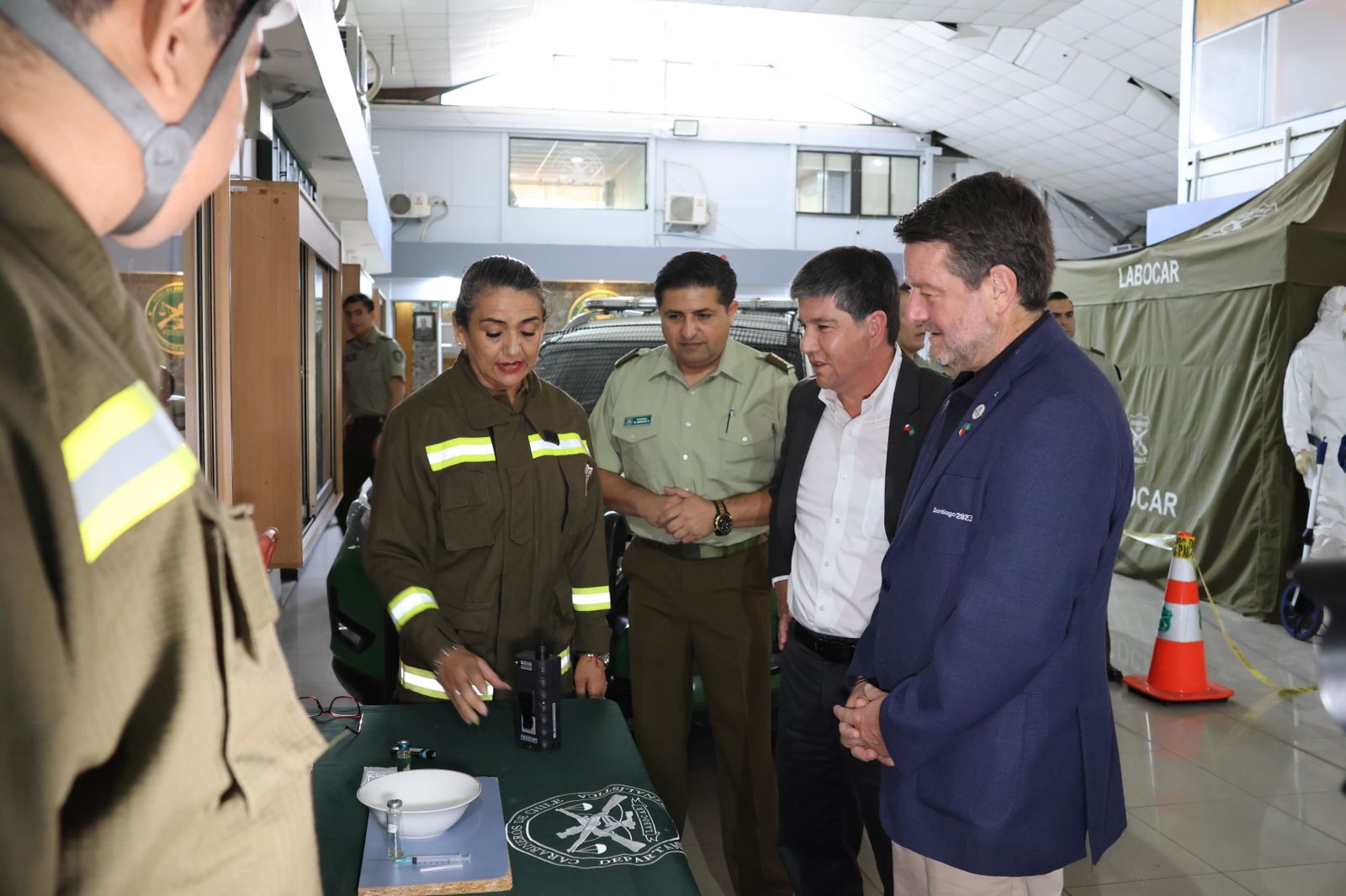 Acompañados por el director de Control de Drogas e Investigación Criminal de Carabineros de Chile, general Jaime Velasco, el subsecretario del Interior, Manuel Monsalve, y el gobernador de la Región Metropolitana, Claudio Orrego, recorrieron las dependencias del Departamento de Criminalística (LABOCAR), ocasión en que acordaron un trabajo colaborativo para fortalecer las capacidades y equipamiento de la institución policial.